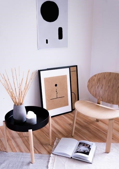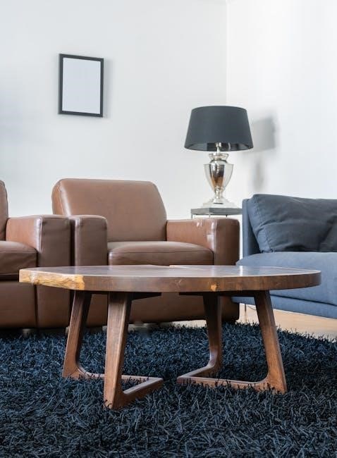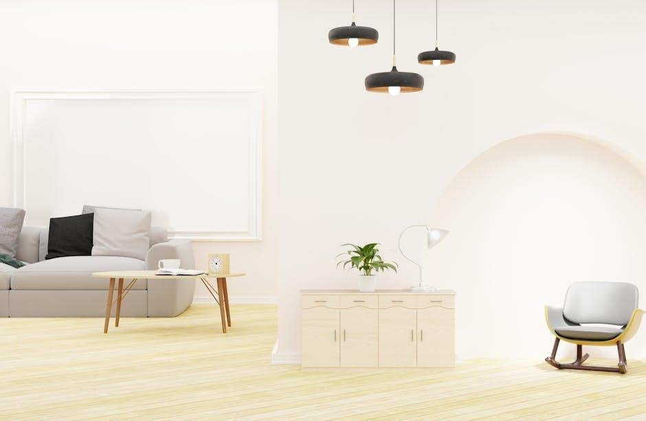 Floating furniture on the rug creates a cohesive look and defines the seating area. Choose a rug large enough to fit all furniture, with 6-12 inches of rug visible around the edges for balance. This layout works well in open-concept spaces, preventing furniture from feeling isolated. Ensure the rug is proportional to the room size and furniture dimensions. A 9×12-foot rug is ideal for most living rooms, providing ample space for a sofa, chairs, and coffee table. This setup adds warmth and harmony to the space.